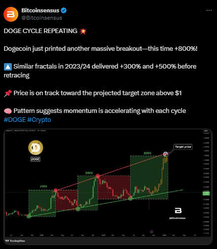 长期周期分析显示,DOGE存在重复出现的结构模式:包括底部构筑、区间收窄以及在明确确认后的上涨。分析师将当前状况与早期阶段对比发现相似性,并指出后期周期的动量加速往往比初期更快。