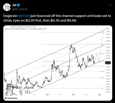 狗狗币价格从通道支撑位反弹,目标阻力位在0.29美元附近。分析师指出,在突破前交易量上升且波动区间收窄。延伸的观察点位于0.45美元、0.86美元以及1美元整数关口附近。