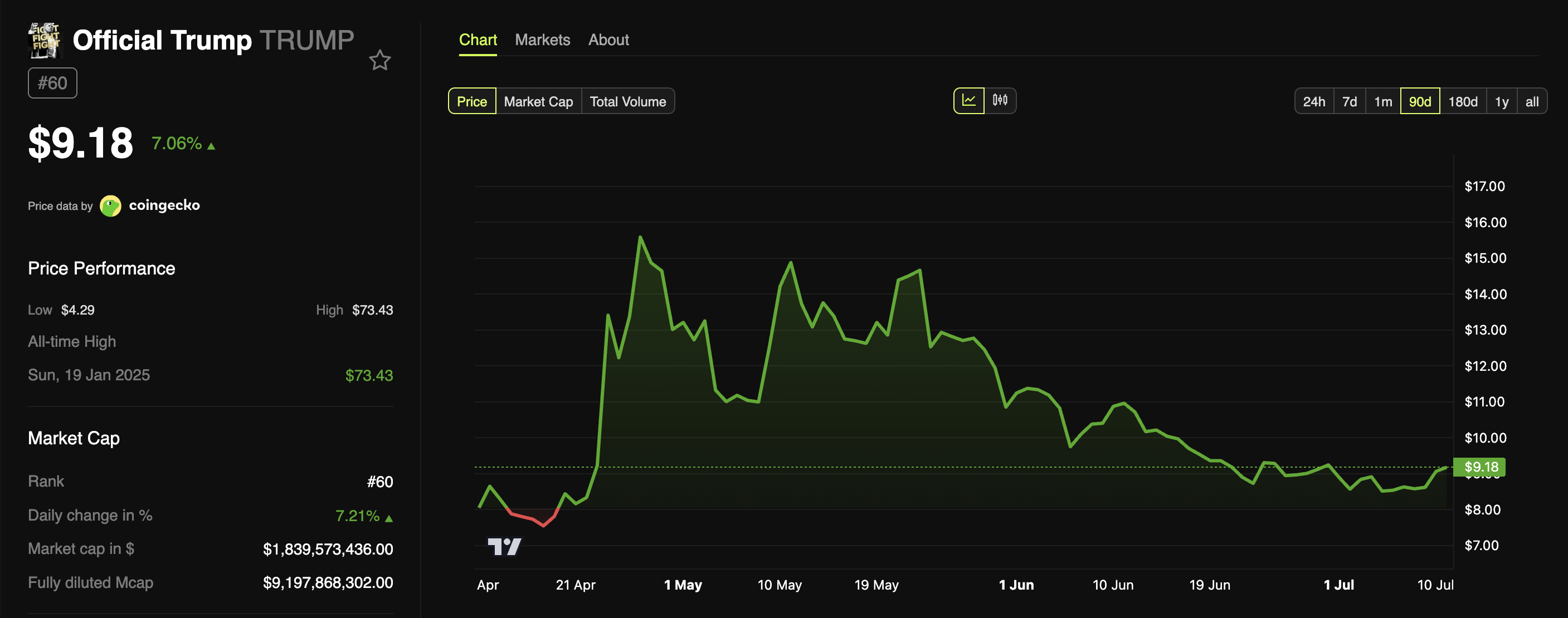 孙宇晨的投资承诺明显提振了市场信心。BeInCrypto数据显示,TRUMP代币24小时内上涨7%,现报9.18美元。交易活跃度同步激增,24小时交易量达4.753亿美元,实现208.60%的惊人增长。