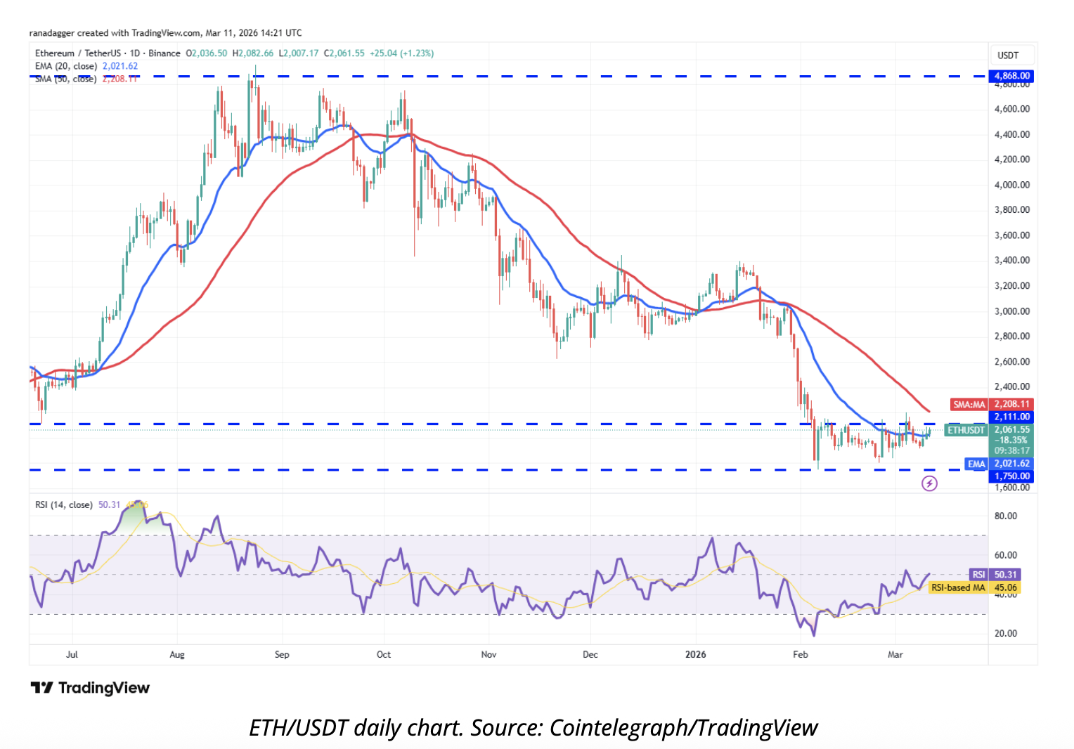 本周以太坊价格约在2068美元,目前正在2111美元阻力位下方盘整。多头正试图将其推高至2200美元的50日简单移动均线上方,若成功突破,该代币有望冲击2600美元并最终挑战3045美元高位。