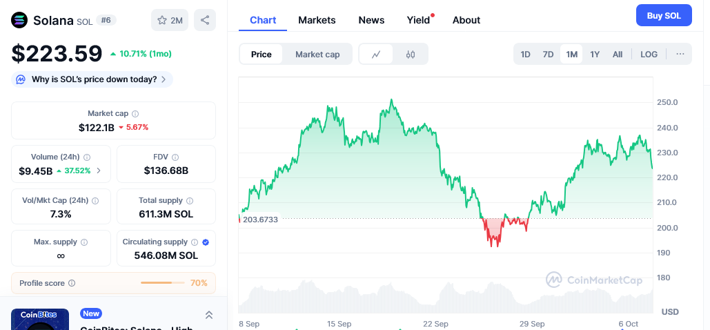 加密货币市场在10月初的反弹力度远超预期。比特币于10月7日创下126,000美元的历史峰值,而Solana与BNB也如预期般迎来显著上涨。截至发稿,Solana价格达222.95美元,周涨幅8.59%;BNB同期飙升27.71%,现报1,279美元。