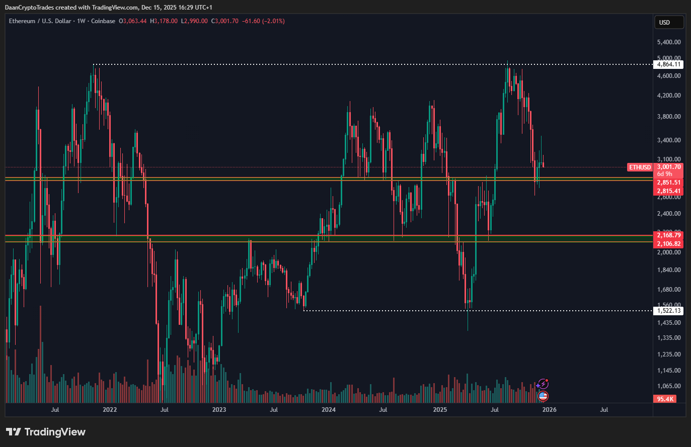 Cointelegraph Markets Pro和TradingView的数据显示,ETH/USD交易对已回落至3000美元下方。分析师兼交易员Daan Crypto Trades针对最新价格走势评论称,虽然本轮周期未达ETH投资者预期,但以太坊的“市场结构和生态系统在此期间已趋于成熟”,并补充道: