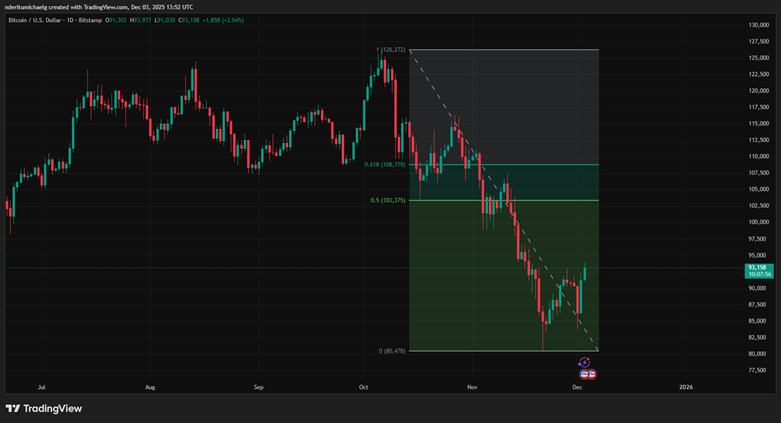 根据9月波段高点至11月低点的斐波那契回撤分析,下一波段高点预计将位于103,500至108,900美元区间。