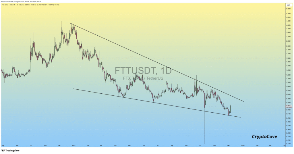 这番评论反映出市场情绪逐渐倾向于FTT可能复制复苏行情中的短期暴涨模式。尽管FTT价格仍远低于前期高点,当前的技术形态已引起动量交易者的关注。目前价格仍处于下降楔形内部运行,若确认突破0.75美元附近的上轨趋势线,可能引发更大幅度的上涨。