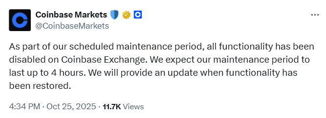 Coinbase交易所通过其X平台官方账户发布公告,确认已进入计划维护时段。本次系统升级于太平洋时间上午7点启动,公司声明维护过程可能持续长达四小时,期间所有交易及资金转移功能将暂停。
