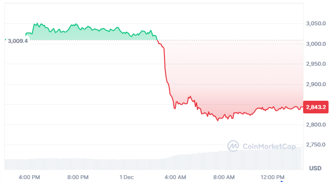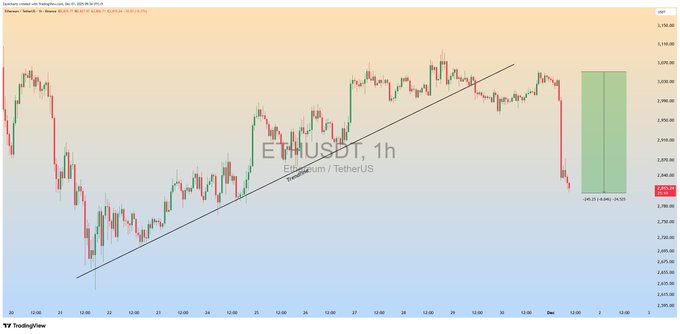 以太坊价格走势已跌破此前支撑多次低点抬高的上升趋势线。该防线经多次测试后最终失守,此前市场对3050美元关口的突破尝试未能延续,形成更低的高点。