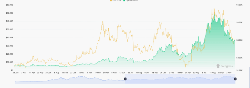 以太坊价格与未平仓合约综合图表清晰展示了杠杆周期与价格波动间的关联。初期阶段未平仓合约在温和趋势中保持稳定,表明投机敞口受限。
