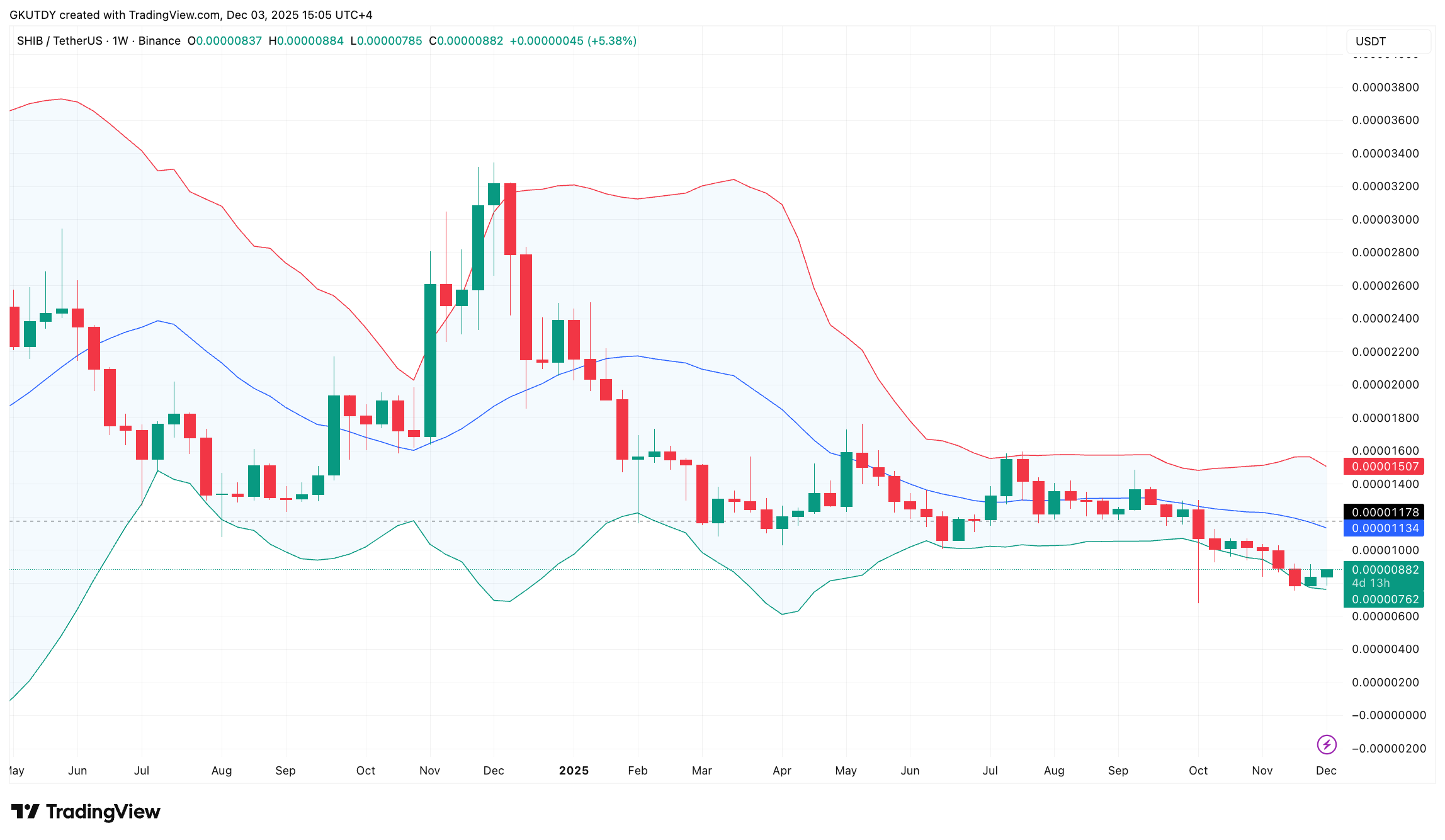 周线布林带呈现清晰格局:SHIB在布林带下轨形成底部反转形态。若市场维持强势,下一目标将直指中轨0.00001134美元。