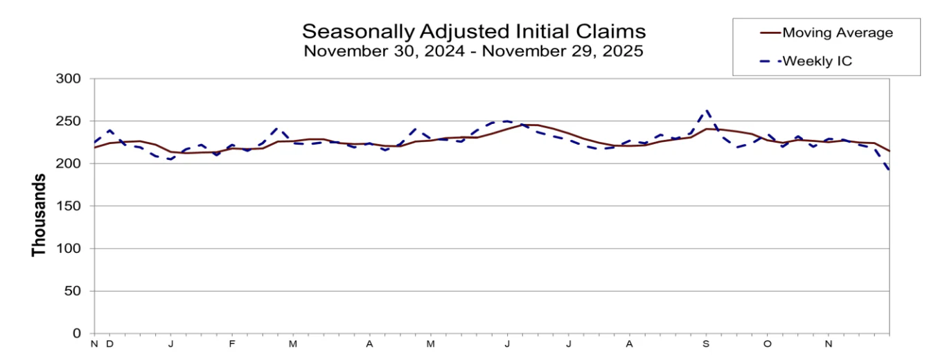 初请失业金人数降至19.1万,远低于经济学家预期的22万,表明即使经济增长放缓,雇主仍不愿裁员。这一降幅是过去几个月来最强劲的周度数据之一,进一步印证了劳动力市场保持惊人稳定的观点。