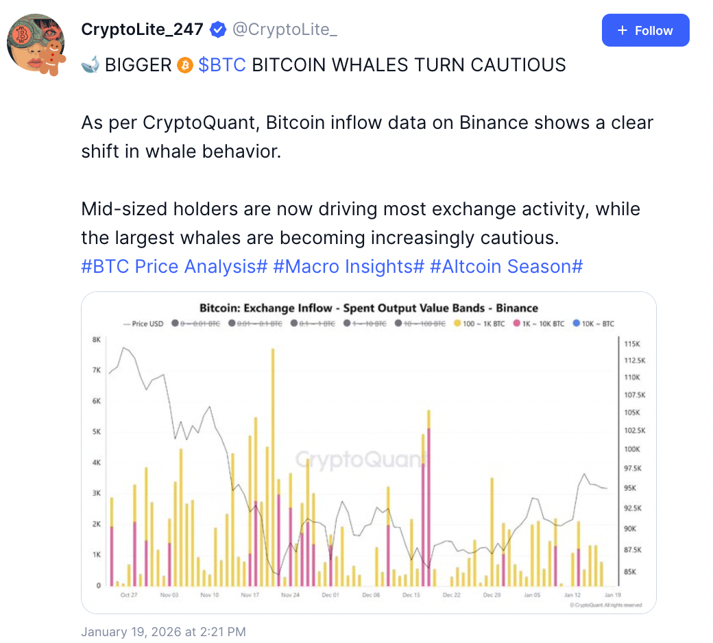 这一点至关重要,因为巨鲸的活动通常在市场回调时提供支撑。缺乏积极的积累,比特币更容易受到散户驱动的波动影响。目前约91,000美元的巨鲸成交量加权平均价已转为阻力位,收复该位置需要显著的现货和衍生品买盘。