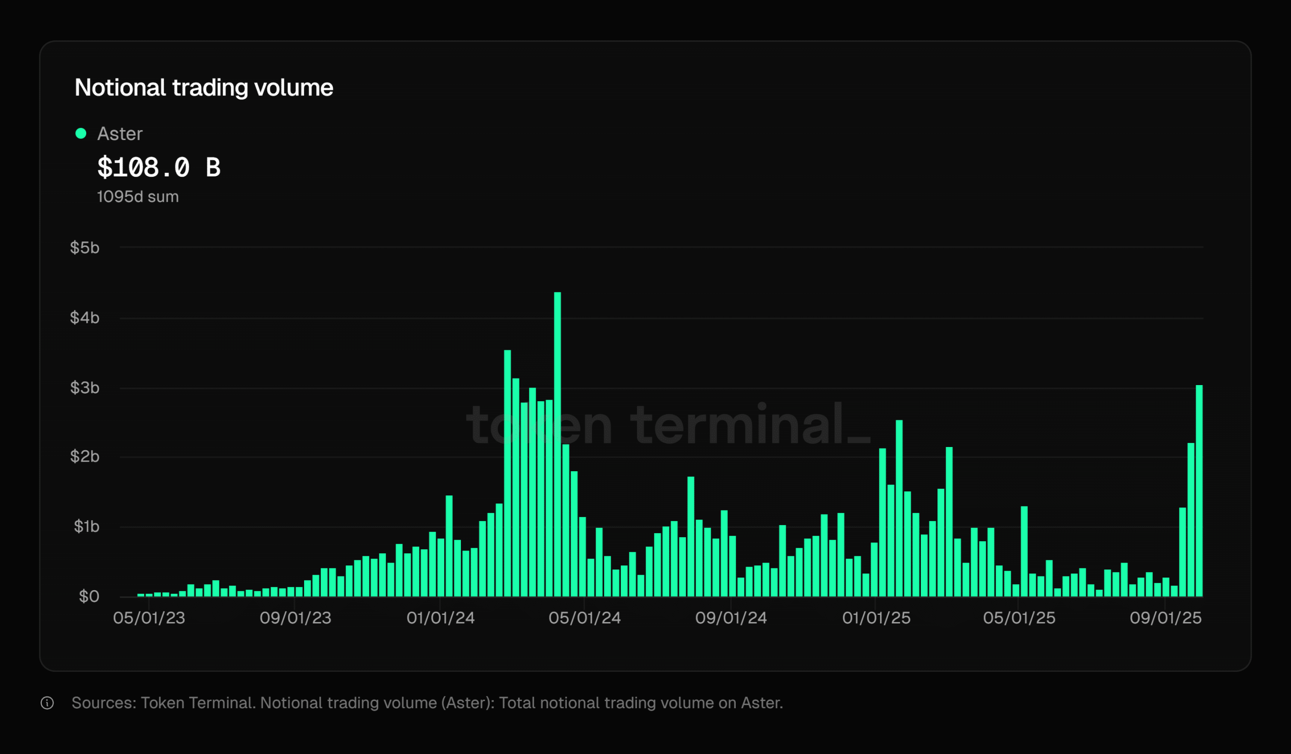 据Token Terminal数据显示,这家去中心化永续合约交易所总交易量已达1080亿美元。这一里程碑表明随着2025年更多交易者使用其平台,Aster正在快速增长。