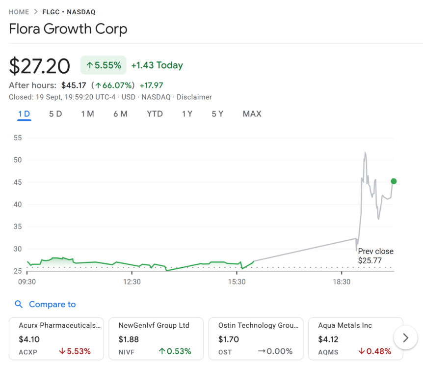 公告发布后Flora Growth股价应声上涨5%。数据来源:谷歌财经