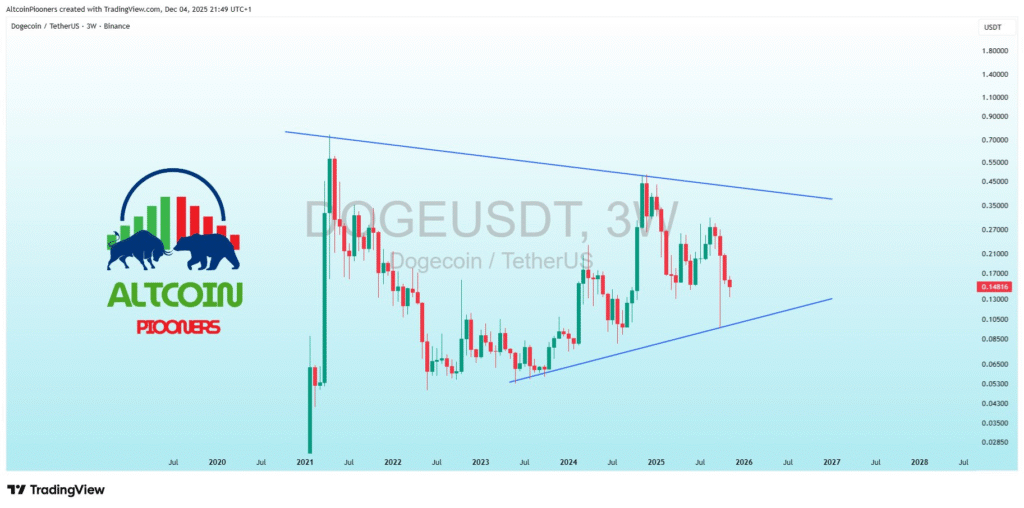 根据Altcoin Piooners的观点,当前0.1401美元的狗狗币仍处于长期上升趋势线上。分析师指出形态整理阶段已完成,其特征是低点逐步抬高且成交量萎缩。虽然价格面临短期下跌,但Altcoin Piooners给出0.72-0.88美元的目标区间,更有分析师预测若市场环境配合,可能上探4-6美元高位。