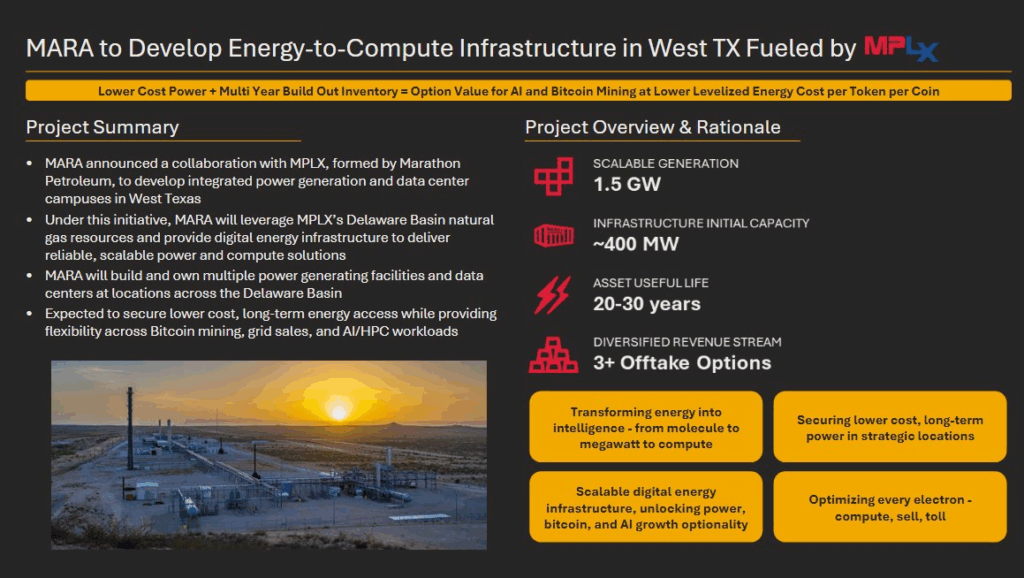 MARA与MPLX合作开发整合电力设施与数据中心园区,充分利用特拉华盆地的天然气资源。