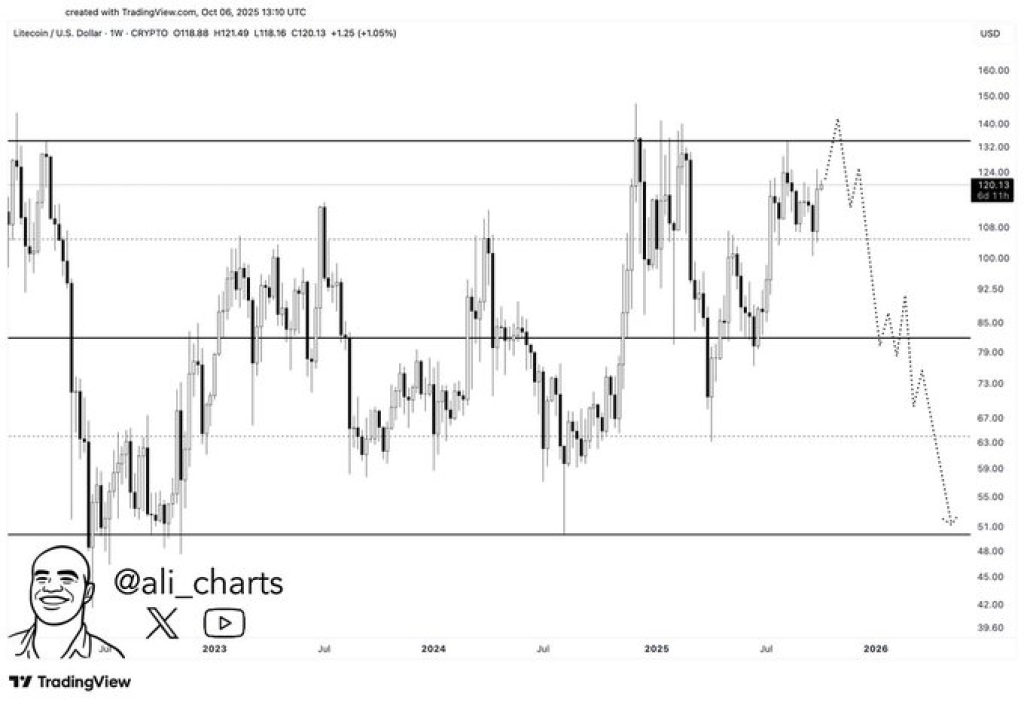 阿里发布的周线图揭示了莱特币可能面临的两种明确走势:一种保持现有上升趋势,另一种则在关键支撑失守后开启下跌通道。