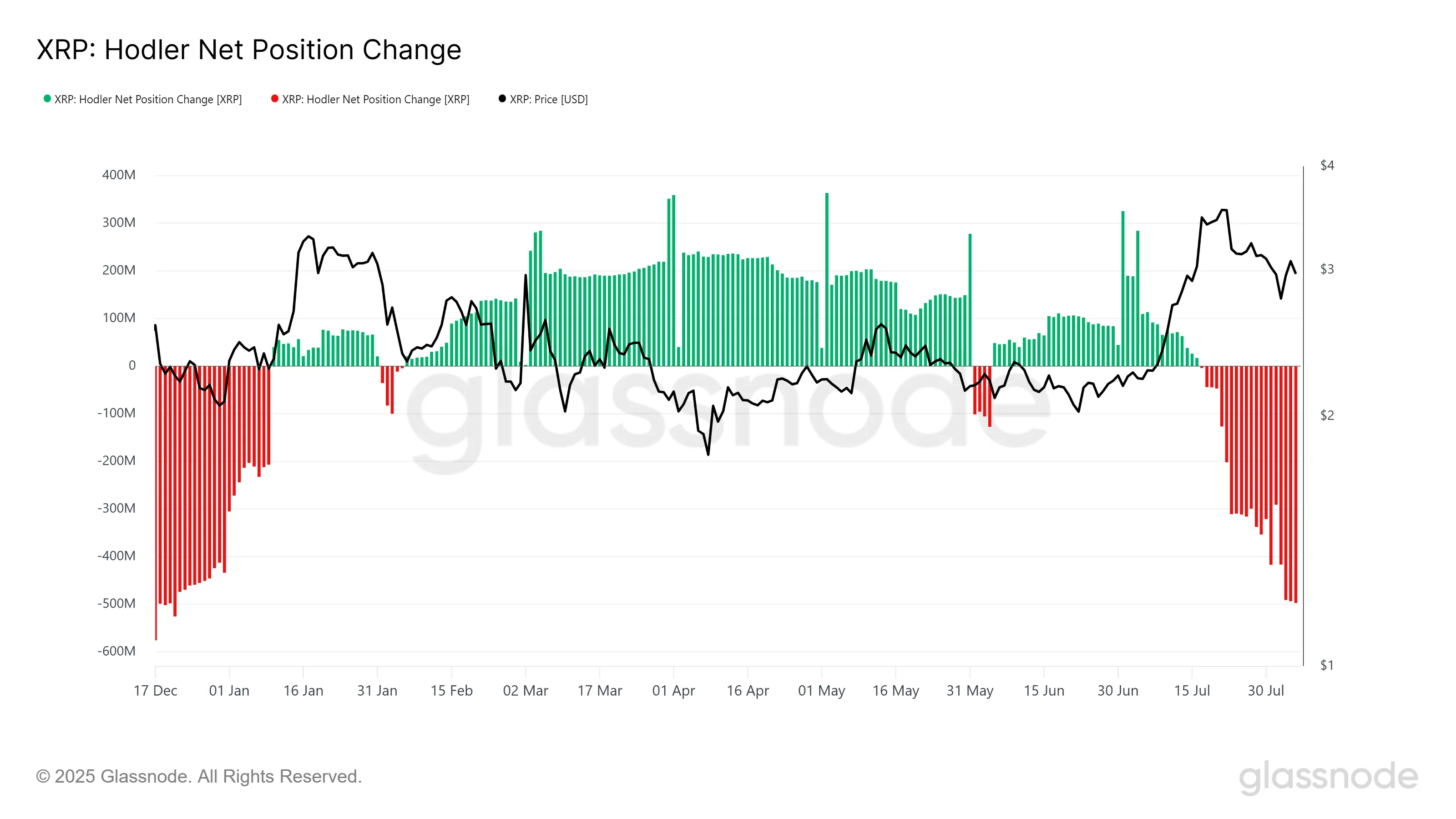 XRP的长期前景同样受到其HODLer净持仓量变化的影响,该指标已跌至七个月低点。数据显示自7月中旬以来,长期持有者(LTH)持续减仓的态势在过去几天明显加剧,这为XRP价格带来了更大的下行压力。作为市场重要风向标的LTH持仓持续减少,正在引发更广泛持有群体的看空情绪,可能引发跟风抛售的连锁反应。