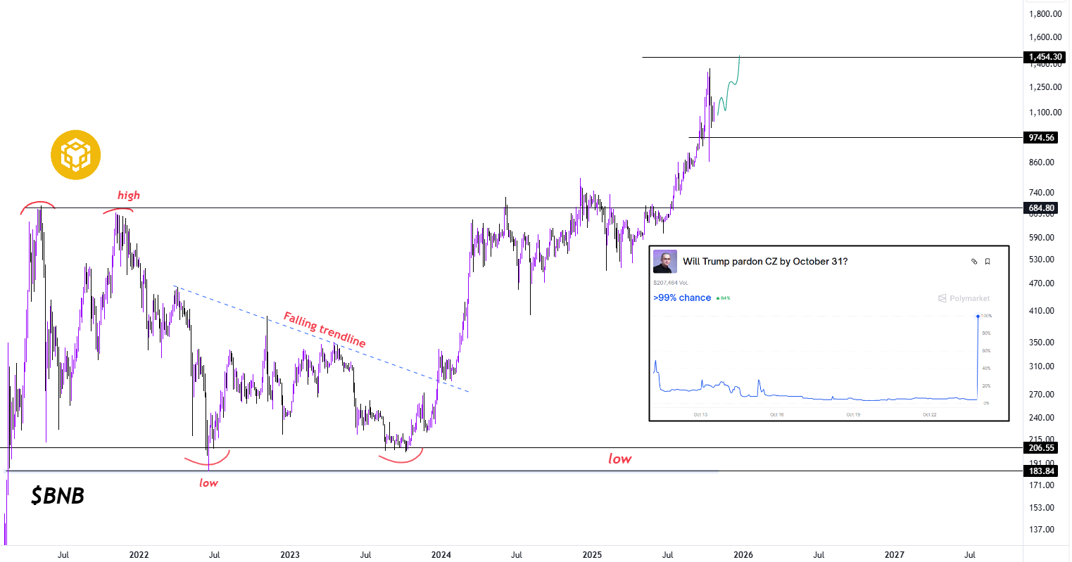 知名分析师Mags通过图表指出,若特赦成真,BNB价格或飙升至1,400美元上方。目前仍在行程中的CZ尚未发表完整声明,事态发展仍存不确定性。任何关于其重返币安的传闻或公告,都可能为BNB价格延续上涨动能提供支撑。此外,像Aster这类山寨币也可能从中获益。