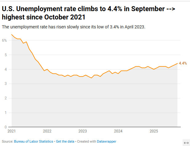 最新报告显示美国就业市场动能减弱:9月新增11.9万个岗位,但前月数据下修至-4000,表明在此前数月实际出现岗位缩减。六月已出现就业负增长,可见这并非孤立现象。