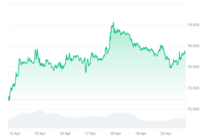 尽管机构资金流参差不齐,且存在利率预期及美伊紧张局势带来的宏观不确定性,但根据CoinMarketCap数据,比特币在4月13日至19日期间交易区间为71,000至78,200美元。