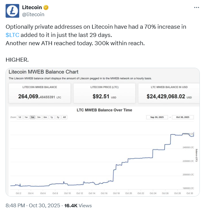 通过MWEB存储的LTC数量达到历史峰值。市场数据显示当前余额为280,119 LTC,其中约90,000 LTC是在10月10日加密货币市场普跌后增持的。