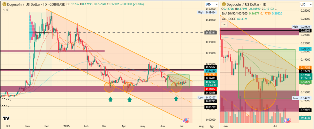 近期DOGE价格图表显示出缓慢但稳定的复苏态势,与7月初其他主流山寨币的上行趋势相呼应。过去7天内,DOGE加密货币涨幅约8%,而过去15天的累积涨幅更是达到惊人的18%。分析师指出,当前价格正接近下降形态的上边界线,若实现有效突破,或将引发重大行情。