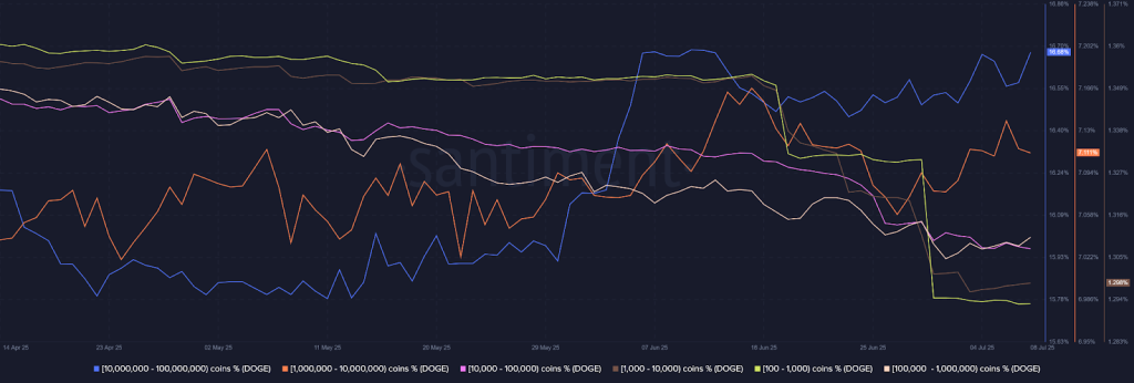 链上数据显示市场结构正在转变:过去15天,持有100万至1亿DOGE的地址数量显著增加,而持有100至100万DOGE的散户地址却在减少。这表明散户正在抛售筹码,而鲸鱼用户持续吸筹,预示着潜在的上行趋势。