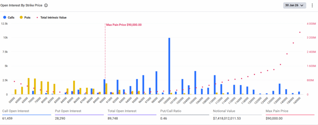 与此同时,比特币的看跌/看涨比率为0.46,表明看涨期权数量多于看跌期权。此后,当前24小时看跌/看涨比率升至1.35,反映出市场普跌后的悲观情绪。数据显示,最大痛点价格为9万美元,意味着多数期权交易者将面临最大亏损。