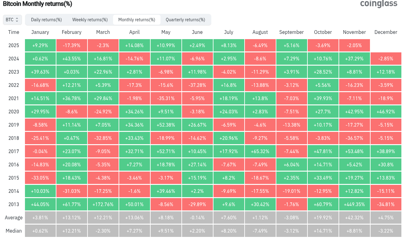 数据显示自2013年以来比特币11月平均涨幅超40%,但今年趋势明显背离。