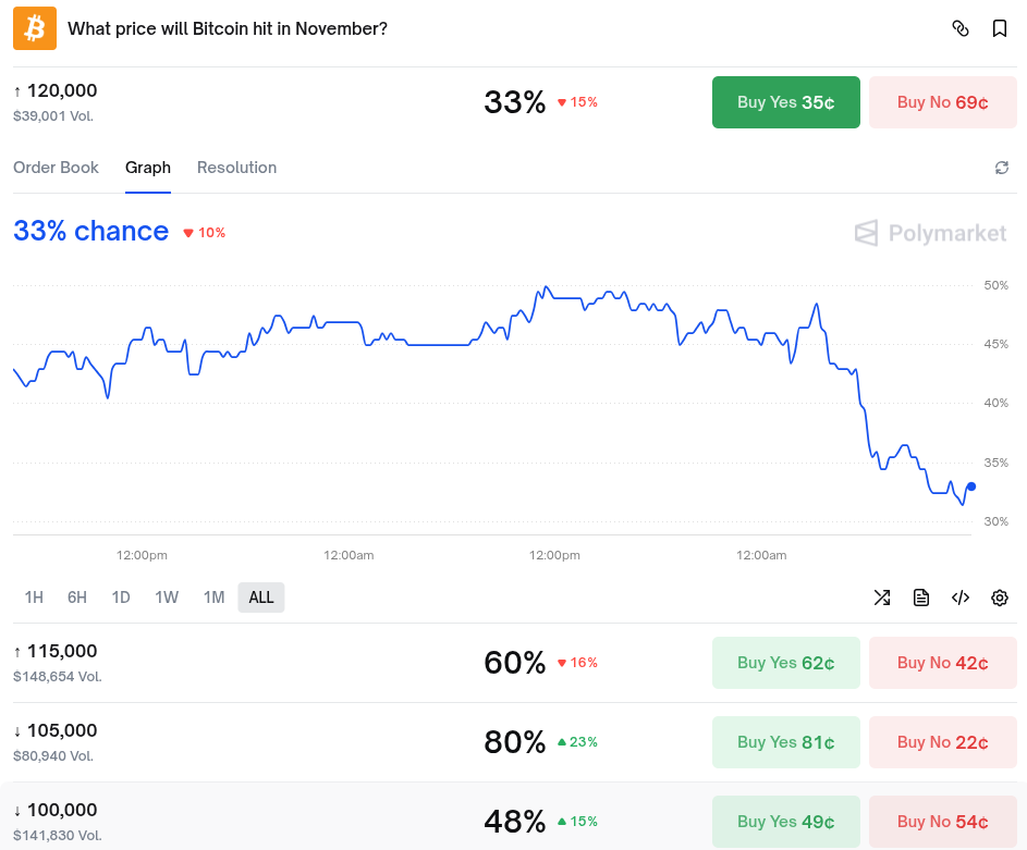 市场情绪指标反映谨慎态度:Polymarket预测比特币11月收于12万美元上方的概率仅33%,11.5万美元概率为60%。加密恐惧与贪婪指数仍处"恐惧"区间,显示即便价格跌破11万美元,投资者仍持观望态度。