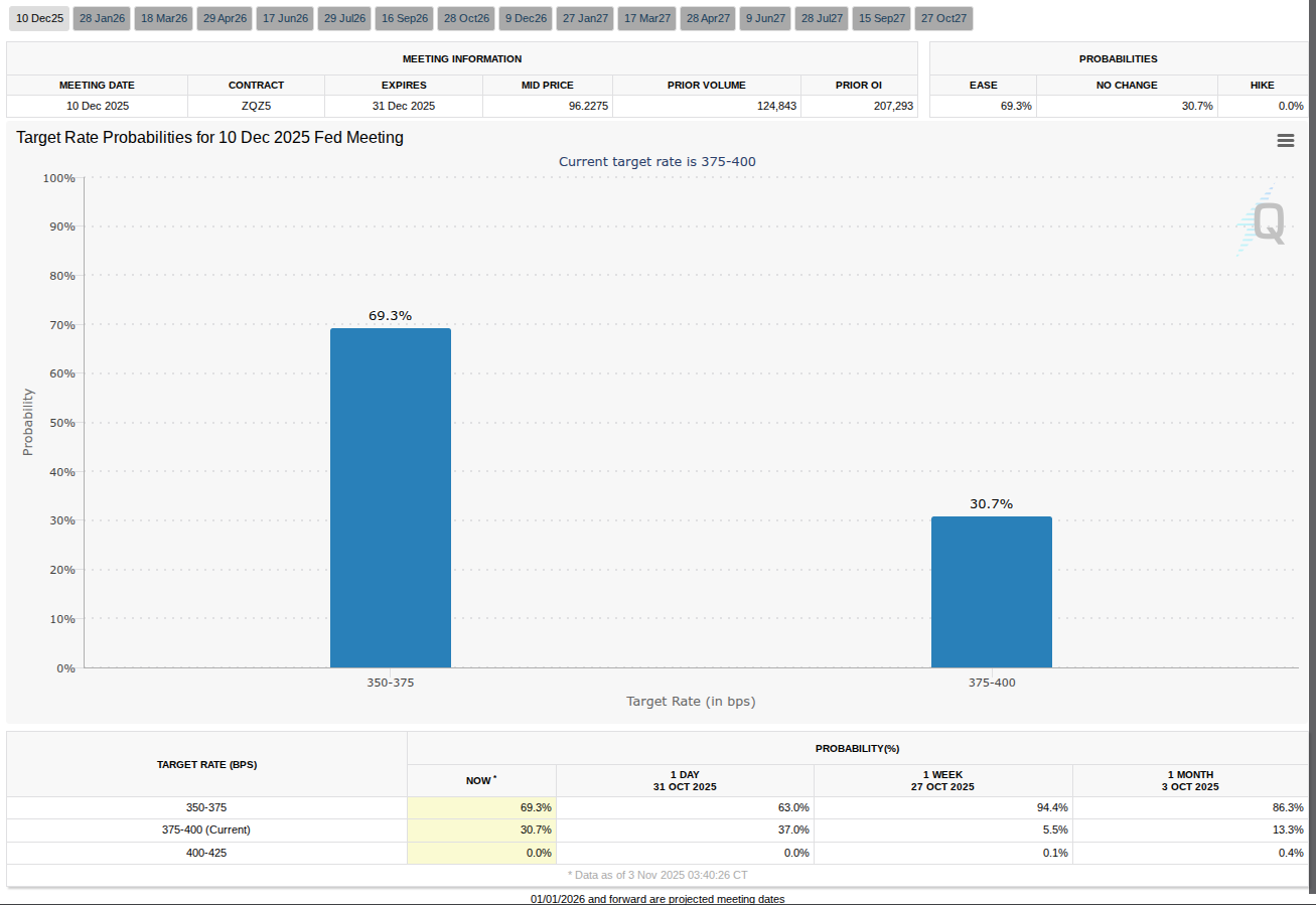 因政府停摆,美国经济数据稀缺,仅私营部门就业数据可窥见劳动力市场状况。尽管对美联储鹰派立场及流动性长期影响的担忧加剧,12月会议降息概率仍达63%。
