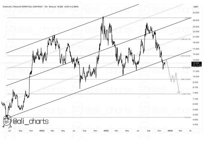 价格走势反映出自从28美元附近见顶以来形成的一系列更低高点,强化了看跌动能。若LINK无法收复失守的通道,当前形态预示下跌趋势将持续。现阶段预测显示潜在目标位可能在8美元支撑区域附近。