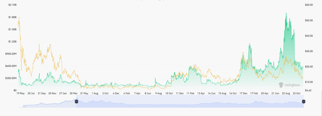 图表后半部分显示当LINK飙升至40-50美元区间时,未平仓合约峰值突破15亿美元。这一增长反映了市场的高投机敞口。随后价格与未平仓合约同步下降,表明随着杠杆平仓和交易者转向更保守持仓,市场正在进行全面重置。