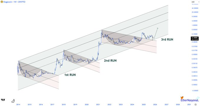 最新图表显示,狗狗币可能正处于第三轮上涨的早期阶段。当前价格位于上升通道中轨附近,形成与过往突破前相似的积累形态。若结构保持完整,价格或将逐步向通道上轨攀升。