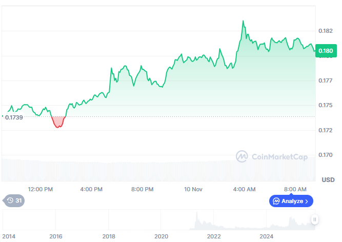 市场数据显示,狗狗币24小时涨幅达3.51%,现价报0.1805美元。交易量增长10.53%至18.9亿美元,总市值维持在273.8亿美元。短期价格在0.1739美元支撑位与0.182美元阻力位间稳步上行,这种稳定性表明当前买盘主要来自长期投资者而非投机行为。