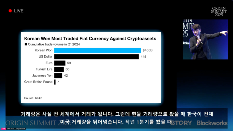 Story Protocol联合创始人兼首席执行官S.Y.李在Origin峰会上指出,据Kaiko数据,韩元与加密货币的交易量已超越包括美元在内的所有其他货币: