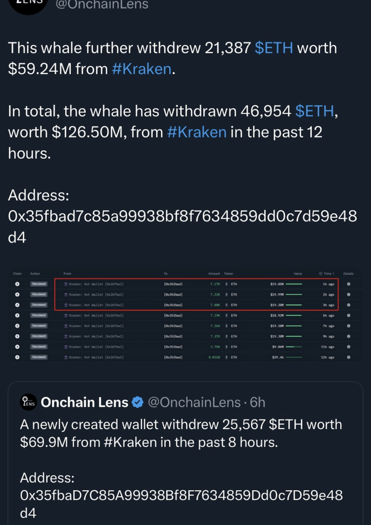 据Onchain Lens数据显示,过去12小时内共有46,000枚ETH(价值1.265亿美元)从Kraken交易所流出。其中仅一个新创建的钱包就在8小时内提走了价值6990万美元的ETH。这种资金外流绝非偶然,它们是明显的积累信号,正在对市场产生影响。