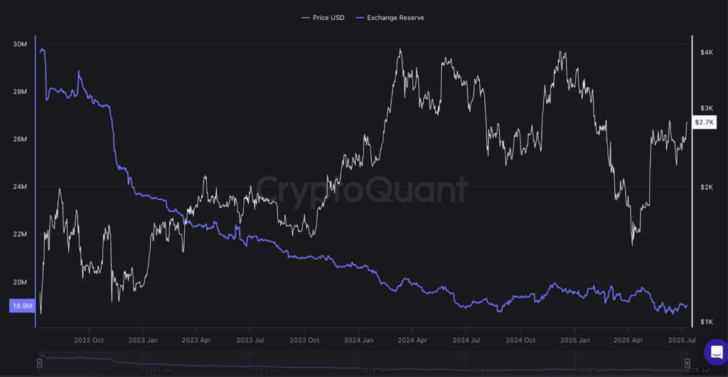 CryptoQuant的交易所储备数据印证了这一趋势:中心化平台上的以太坊供应量已降至1890万枚,接近2022年年中以来的最低水平。当交易所供应量如此萎缩时,往往意味着投资者准备长期持有而非抛售。