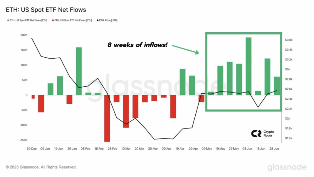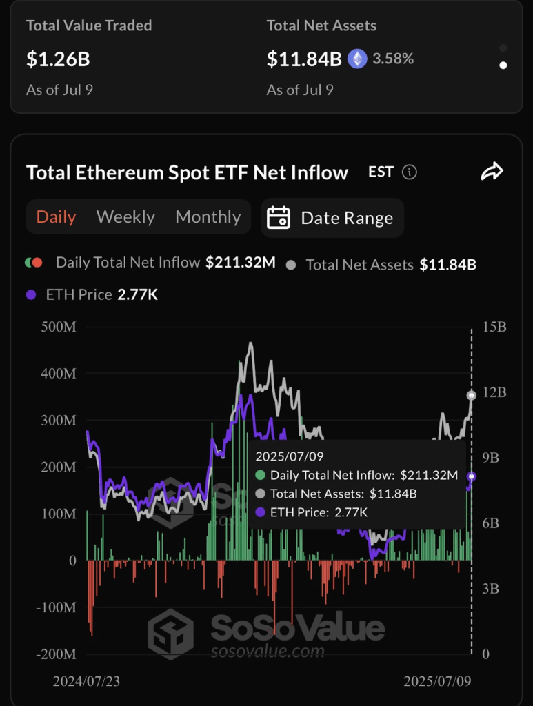 现货以太坊ETF正在兑现市场期待。据SoSoValue统计,仅7月9日单日ETH产品就录得2.11亿美元净流入。过去四天持续保持资金净流入,标志着连续第八周的资金增持。