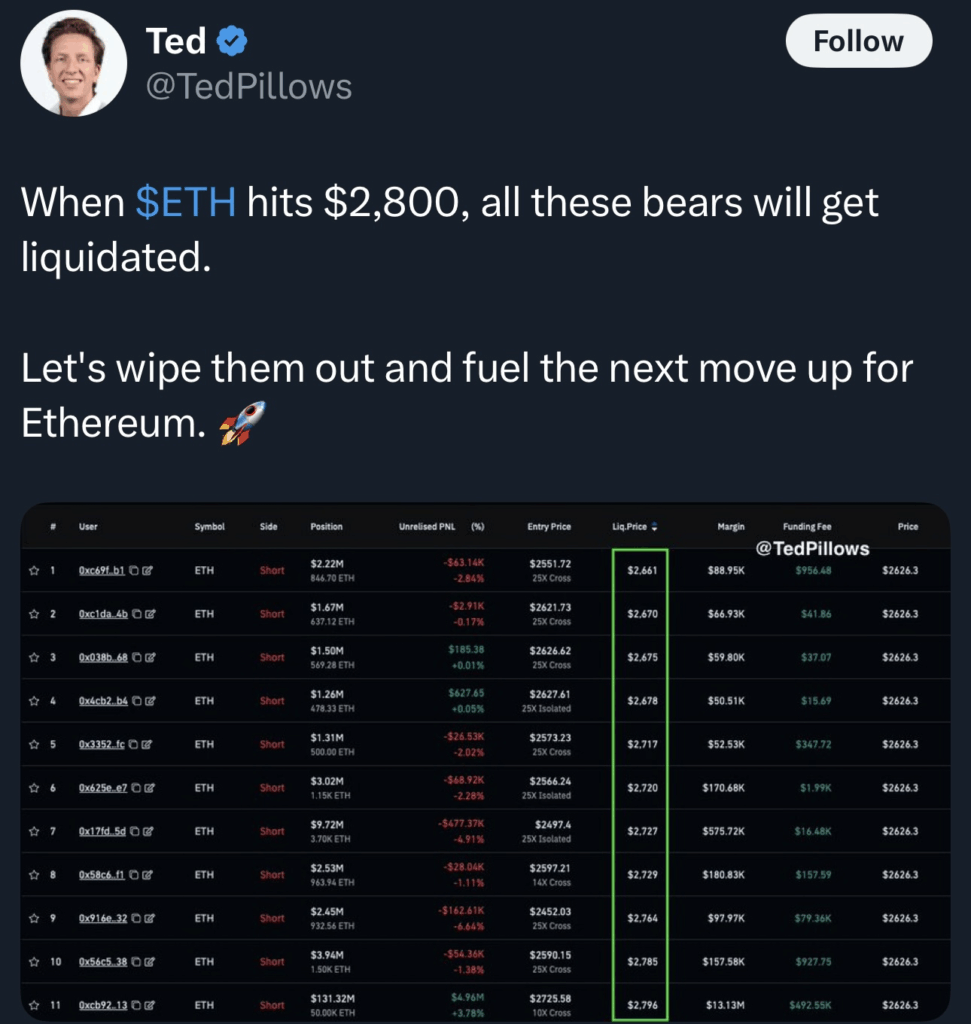 分析师@TedPillows的数据显示,2775美元区域曾存在大规模清算集群。随着ETH突破该价位,数以千计的空头头寸面临爆仓风险。强制平仓产生的自动买盘形成了典型的空头挤压行情。