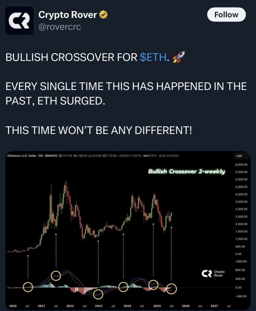 加密货币分析师@CryptoRover指出,ETH出现两周看涨MACD金叉——该信号自2020年以来准确预示了以太坊所有重大上涨行情。这不是普通的参考指标,每次出现该信号后ETH都实现了垂直上涨。