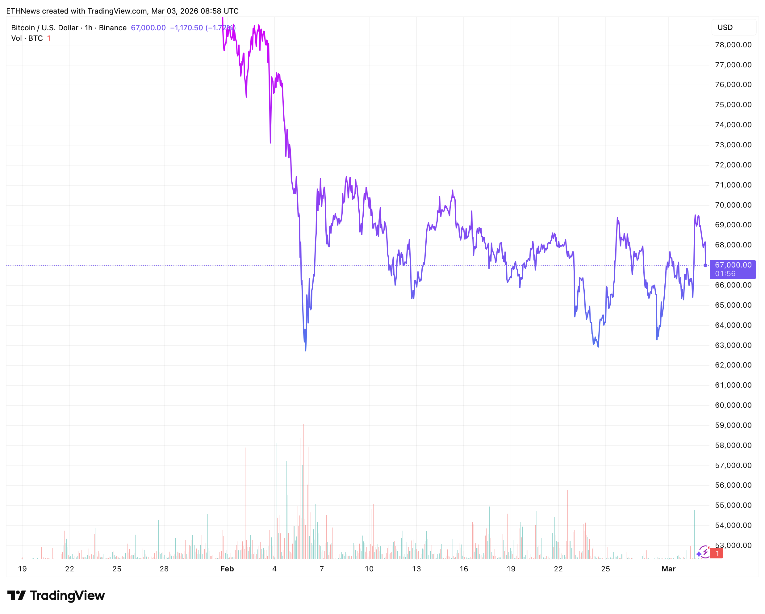 考虑到当时背景,比特币在3月2日触及70,000美元令人意外。周末期间美国-以色列-伊朗冲突曾将价格打压至约63,000美元。地缘政治风险处于年内最高水平。亚洲股市遭遇猛烈抛售,韩国综合股价指数单日跌幅超过7%。全球市场情绪呈现避险态势。