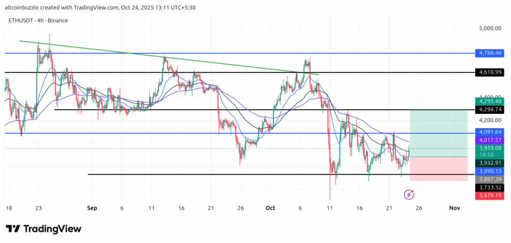 50日EMA(4100美元)与100日EMA(4000美元)形成死亡交叉,当前价3959美元位于双均线之下,显示明确看跌趋势。