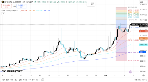 BNB在10月继续稳守1,200美元关口,买盘活跃和技术结构稳固推动其保持看涨动能。当前币价轻松高于关键指数移动平均线,20日均线(1,152美元)与50日均线(1,098美元)同步上扬,彰显短期强势。100日均线(1,048美元)和200日均线(991美元)则构成长期结构性支撑。