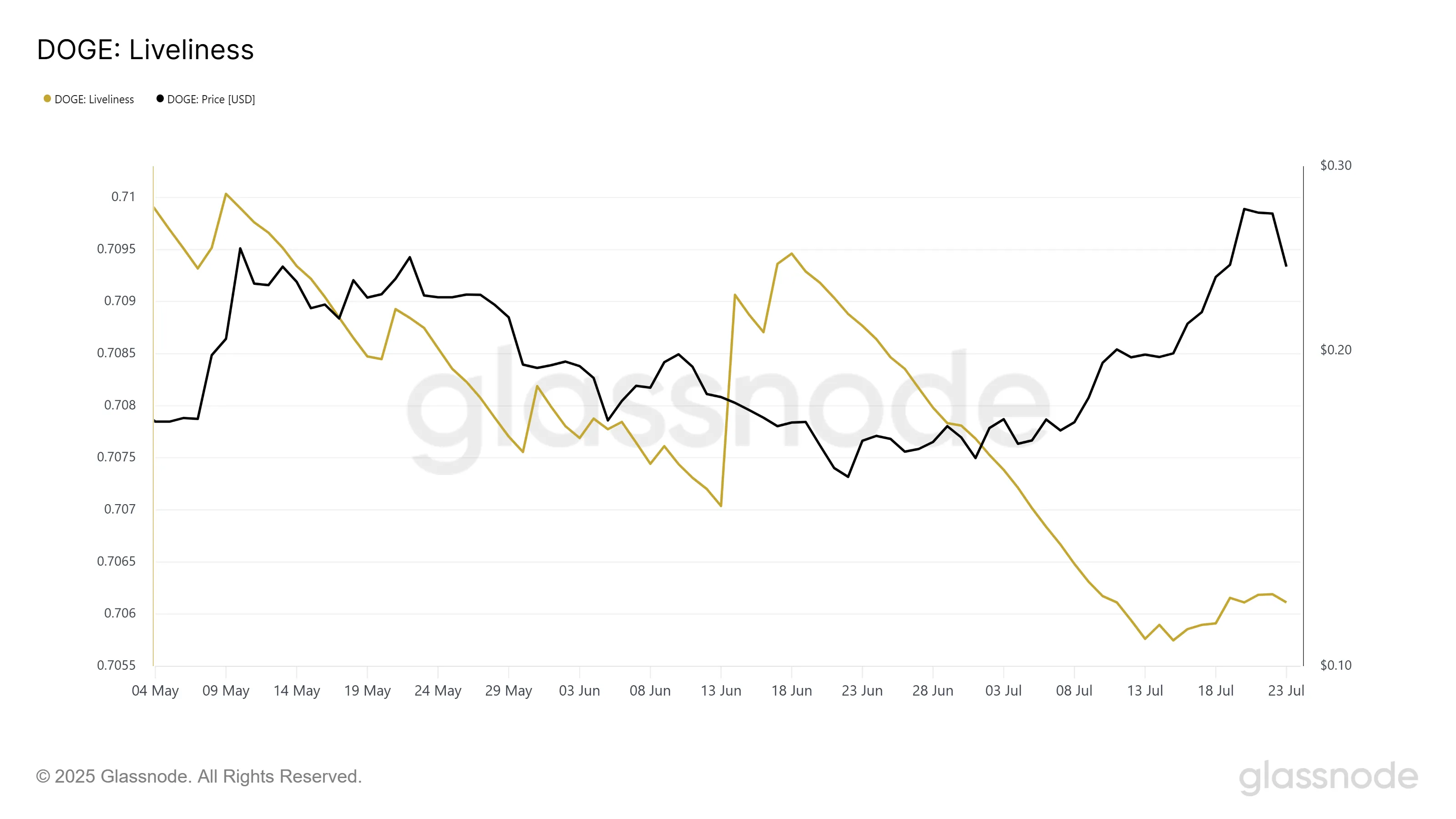尽管存在获利回吐,Liveliness指标的下降表明狗狗币的宏观走势并未受到冲击。该指标用于衡量长期持有者(LTHs)的活动,而这批投资者往往对币价产生重要影响。目前Liveliness持续走低,显示长期持有者仍不愿抛售持仓。