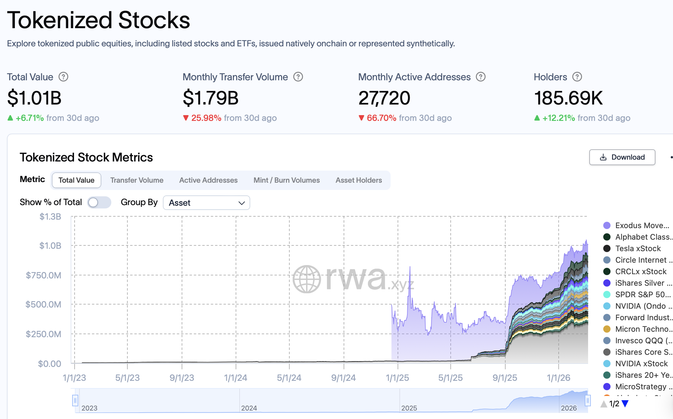 根据 RWA.xyz 的数据,链上代币化公开股票的总价值已增长至约 10.1 亿美元。