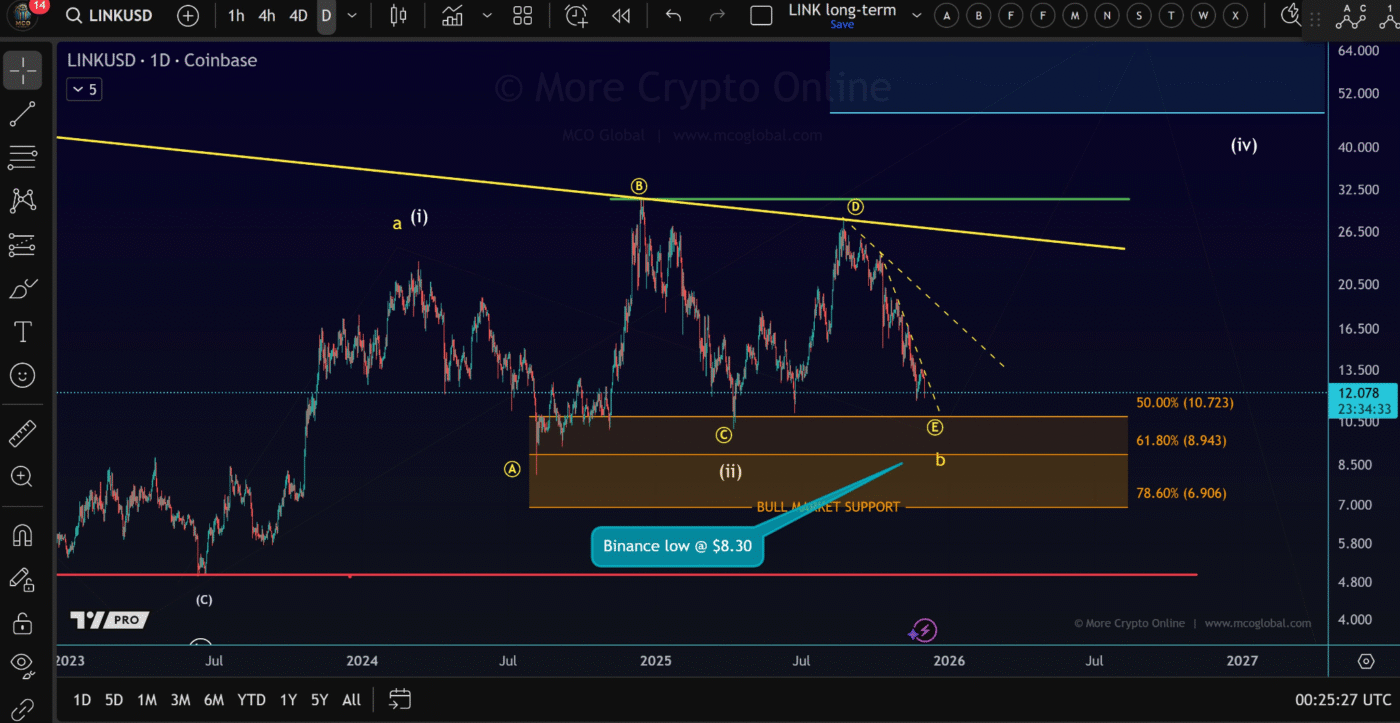 关键支撑位现在位于10.70美元、8.94美元和6.90美元。跌破6.90美元将增加LINK实际上正在发展更大级别第四浪修正的可能性。这种情况将把下跌趋势大幅延伸至更低区间,反映了市场普遍的 uncertainty。这些分层支撑突显了LINK当前 position 的脆弱性。