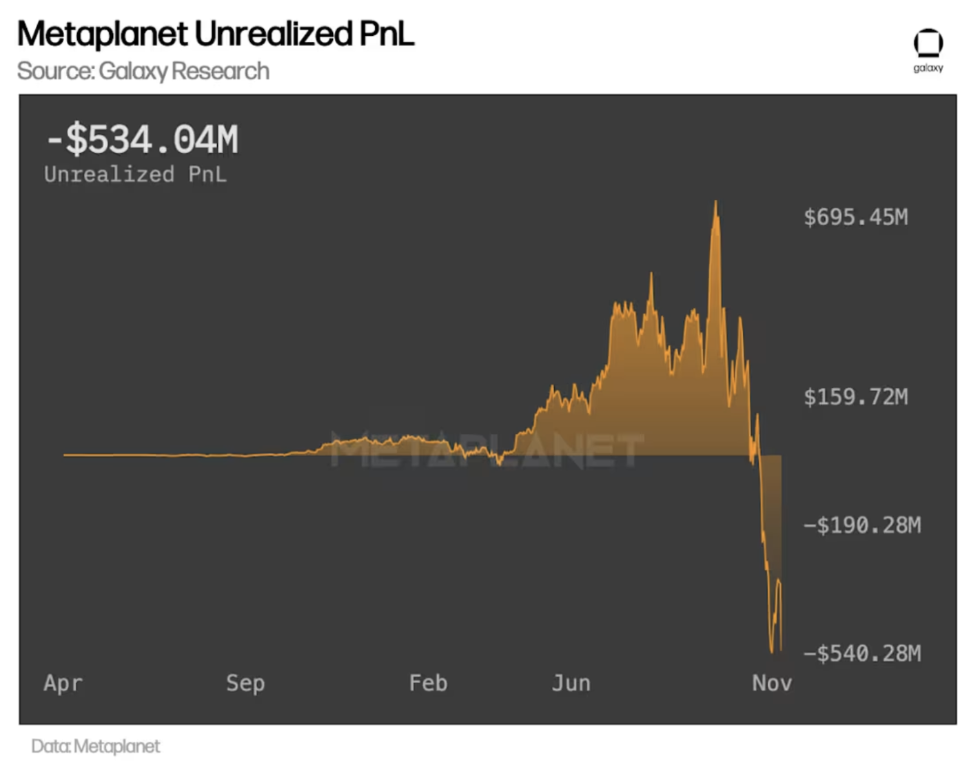 根据银河的报告,长期以来,财库公司的股票交易价格高于比特币的净资产价值,起到了比特币杠杆头寸的作用。然而,随着这种结构开始崩溃,同样的金融工程现在加剧了下行趋势。像Metaplanet和Nakamoto这样的公司,在以平均高于107,000美元的价格购买的比特币头寸上遭受了重大损失。NAKA从峰值下跌98%,在报告中被比作“迷因币崩溃”。