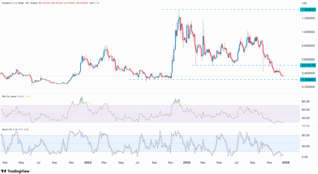 卡尔达诺交易价格较12月峰值下跌73%,正逼近0.3056美元关键支撑位,技术性反弹预期升温。RSI和随机指标等超卖信号显示卖压可能减弱,为上行行情创造空间。NIGHT代币推出后,卡尔达诺链上DeFi交易量在12月实现翻倍,表明链上活动与用户参与度正在复苏。