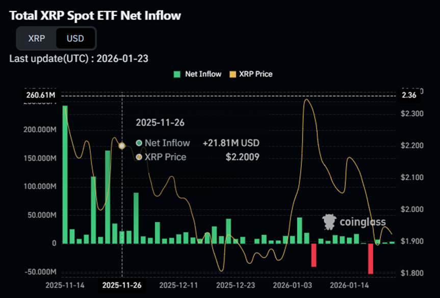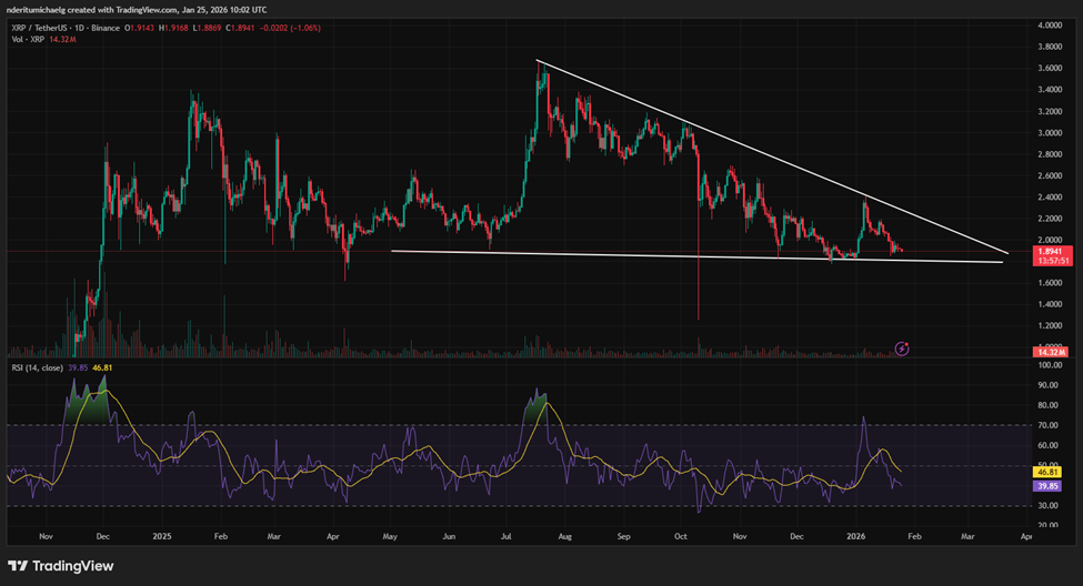 XRP价格走势或许能提供未来方向的线索。该资产数月来持续在楔形区间内震荡,近期触及形态下降阻力线后再度回落。去年12月XRP曾从楔形下轨(支撑位)反弹,而在一月初开始的整体跌势影响下,上周价格已逼近同一支撑区域。