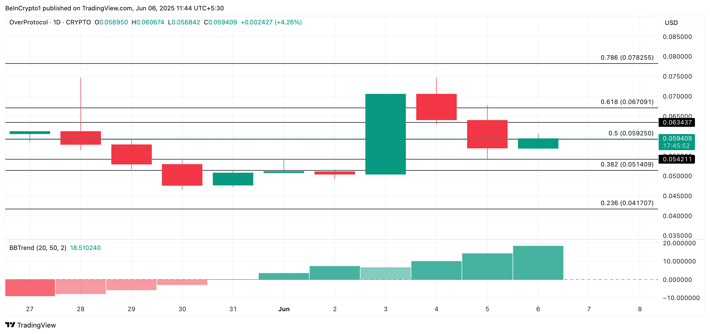 当前OVER报价0.059美元,24小时跌幅6%。虽然价格回调,但技术指标显示整体市场情绪仍偏乐观。其BBTrend指标呈现高大的绿色柱状图,表明买盘动能持续强劲。价格与指标间的背离暗示近期下跌仅是上升趋势中的暂时回调。